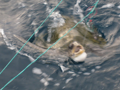 Not long after our engine was restored to normal working order was a potential disaster narrowly averted. We happen to be in the happy Ecuadorian fishing grounds and waters that are riddled with miles and miles of long-lines. Tiny Clorox bottles or small Styrofoam buoys are placed 100 yards apart and are attached to a mainline (if they are attached at all) that may stretch as long as ten miles (longest length reported by our fleet) that has droplines that have baited hooks. There is no way to safely maneuver between the buoys and be assured of not tangling the prop. In fact, one of the boats in the fleet tried to do just that and paid the price. I spotted a set of these buoys just minutes before entanglement and I altered course toward a boat spotted several miles off of starboard. We approached the fisherman and I started a conversation with them and grilled them about the depth of the lines ("just under the water"), how long they may be ("many miles"), and how is the fishing ("very good. you have beer? we have fish.") So, I found a new lure for mahi and you never have to drop a line. Throw 'em a six-pack of cheap Panamanian beer and you will catch a cleaned and iced fish every time. Something tells me they won on that one, but the knowledge acquired is invaluable. Last night we avoided entanglement by running toward the boats and then figuring out the drift of their lines and passing them across their bows. It would be nice to be able to hail them on the radio and give our position but seeing that they have no radios or refuse to answer, I found myself on a tired night watch last night grumbling into the microphone in Spanish my location, my heading, and how I can't believe that none of them have at least a portable vhf. Tonight I will probably do the same.